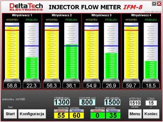 Los Menzies deben vaciarse a fondo después de cada prueba y limpiarse o sustituirse de vez en cuando. El caudalímetro IFM-8 carece de estos inconvenientes y sólo requiere una mayor atención a la hora de conectar un conjunto de inyectores. En esta situación, debe realizar la prueba del inyector durante un tiempo y esperar a que los tubos se llenen de aceite y eliminen el aire no deseado. Una vez que los conductos están llenos de combustible, el aparato puede mostrar los valores medidos en cuanto se inicia la prueba. Sólo es necesario esperar unos segundos para que el caudal se estabilice. En poco tiempo, se pueden repetir las mediciones de un conjunto de inyectores con diferentes parámetros de prueba: cambiando la presión del raíl y el tiempo de inyección. Esto hace que trabajar con el caudalímetro IFM-8 sea más rápido y limpio que utilizar un juego de manómetros convencional.