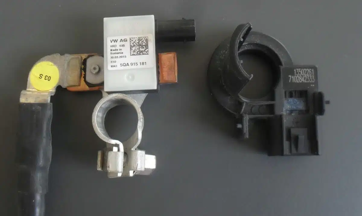Sensores de corriente – a la izquierda la pinza inteligente (5QA915181), a la derecha el sensor de corriente (13502261) que fluye por el cable que va a la batería.