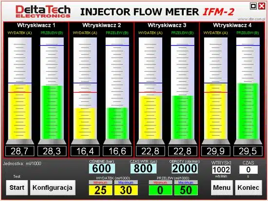 Dane testowe wtryskiwaczy są związane z charakterystyką sygnałów sterujących. Należy skorzystać z bazy danych stołu probierczego na którym zamontowano IFM-2 (w przypadku jeśli zastępuje on menzurki) lub samodzielnie opracować takie procedury dla typowych wtryskiwaczy w przypadku stołów budowanych samodzielnie.